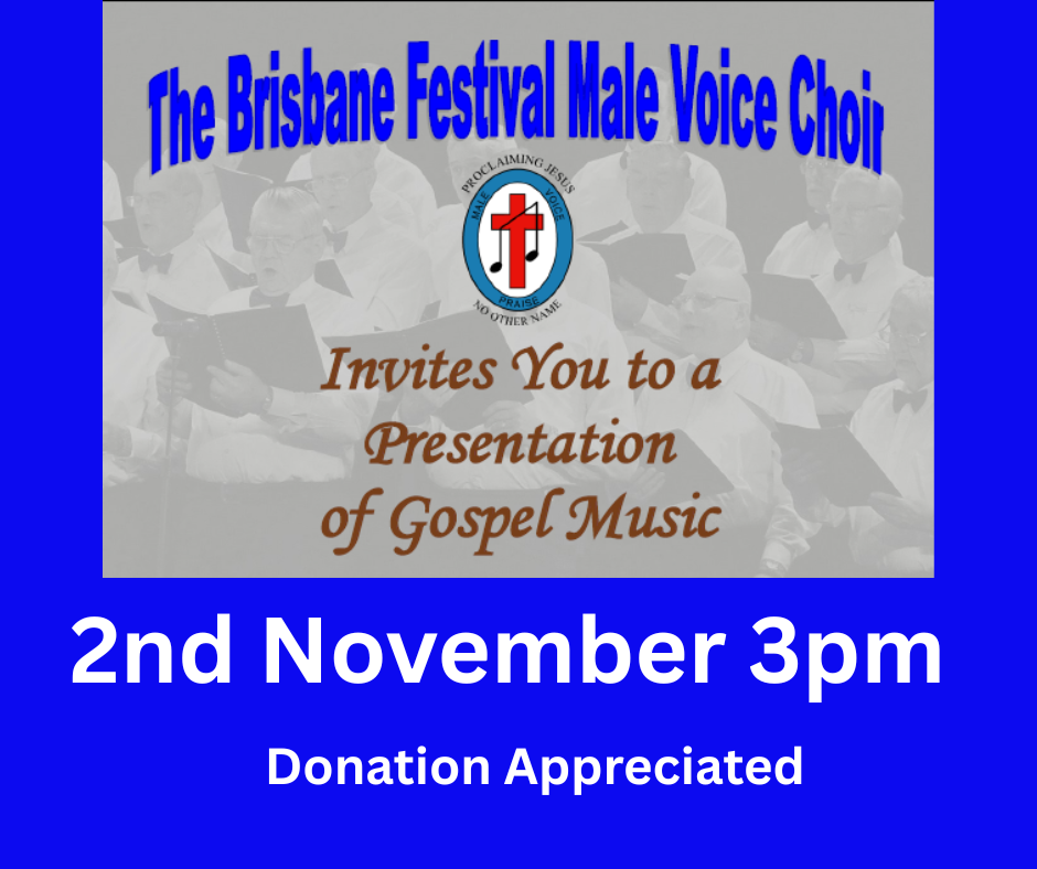 Our sincerest condolences are expressed for the family of betty McClure. Betty had a fall last week and died on Thursday. She was a lovely lady, much loved by family and friends and will be sorely missed. Alan D is finally out of hospital and in new digs at Labrador Gardens, and Portia has moved to Hillview and would appreciate visitors I’m sure. We have a new sliding door – and it works like a charm, it will be interesting to see how it stands up to wild weather, but it’s nice to be able to use both entrances to the church again – thank you Cassandra for making this happen. We got excited when the tables were delivered last week, only to discover they did not have the legs that press into an underneath mould as advertised – so at some stage they will be collected and we will continue to look for tables similar to a couple we already have. Because the Alicia Street Market is on a Sunday, we are asking our cooks and others who might be interested, to create an item for order, that can be collected from the hall on Wednesday 17th December. Please let Cass know what you are willing to make so she can perform a cost analysis and insure we are getting a good return on the ingredients we are happy to supply. If you can make a sample of your wares to have at the November market, we can take orders both then and throughout the week with the other patrons who come to our buildings – then in December we will have orders ready for pick up. It’s incredible to think Christmas is so close. We would love to see you on Sunday afternoon at the Brisbane Male Voice Choir – you won’t be disappointed!