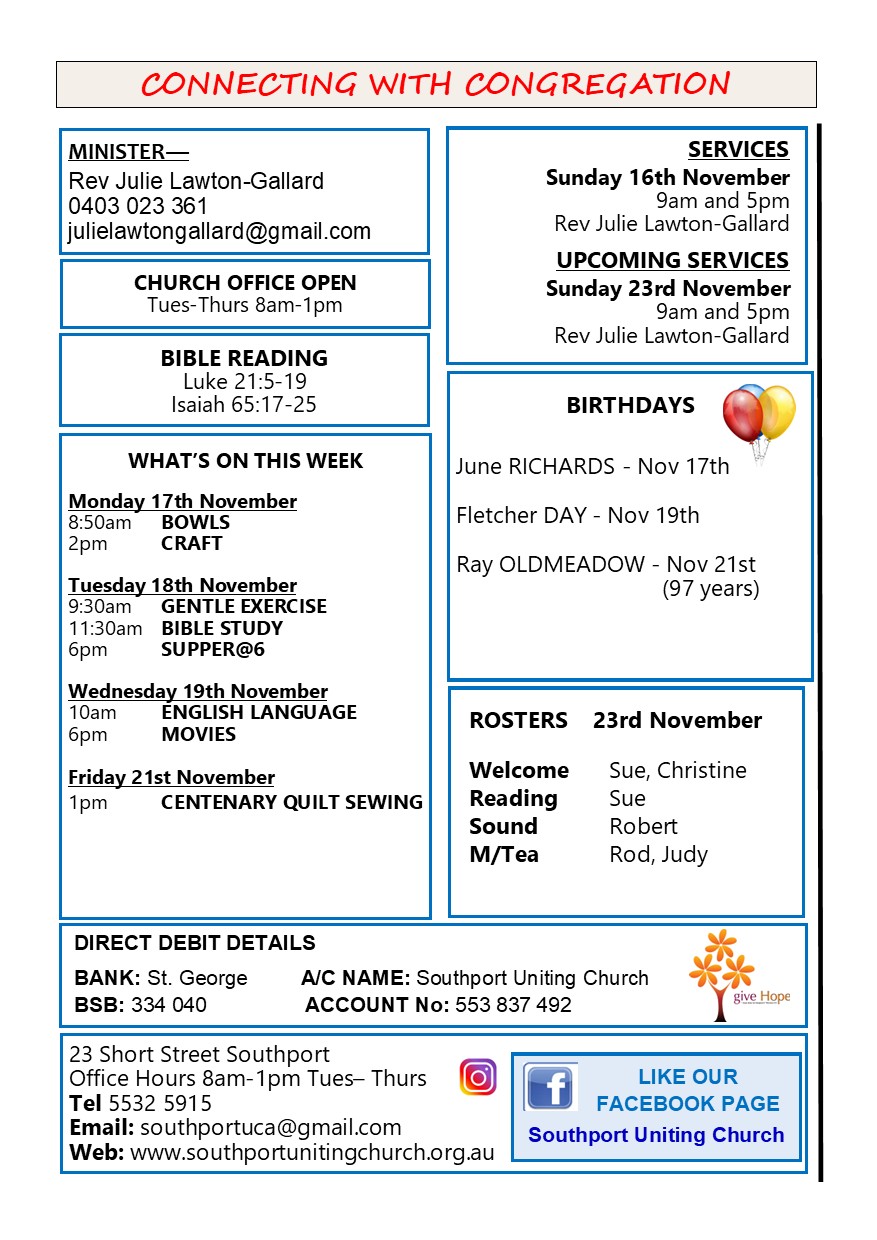 finances?” Christine has donated her time and skill and I know the classes have been enjoyed very much and she will be missed terribly. There is a growing trend within our culture to request “no funeral when I die.” On one level, this is very humble and selfless, but the reality is, a funeral is not for the person who died, but those of us left to grieve and wonder how will we do like now it’s been changed irrevocably forever. Repeatedly I hear from friends and family “but we’ve had no closure.” Funerals/memorial services allow us to grieve corporately. We don’t love going to them – many people loathe them, but they enable us to honour someone we love; to share hope of faith in a loving God and therefore eternal life; to make the persons death a reality; and enable story sharing of memories that will last forever.