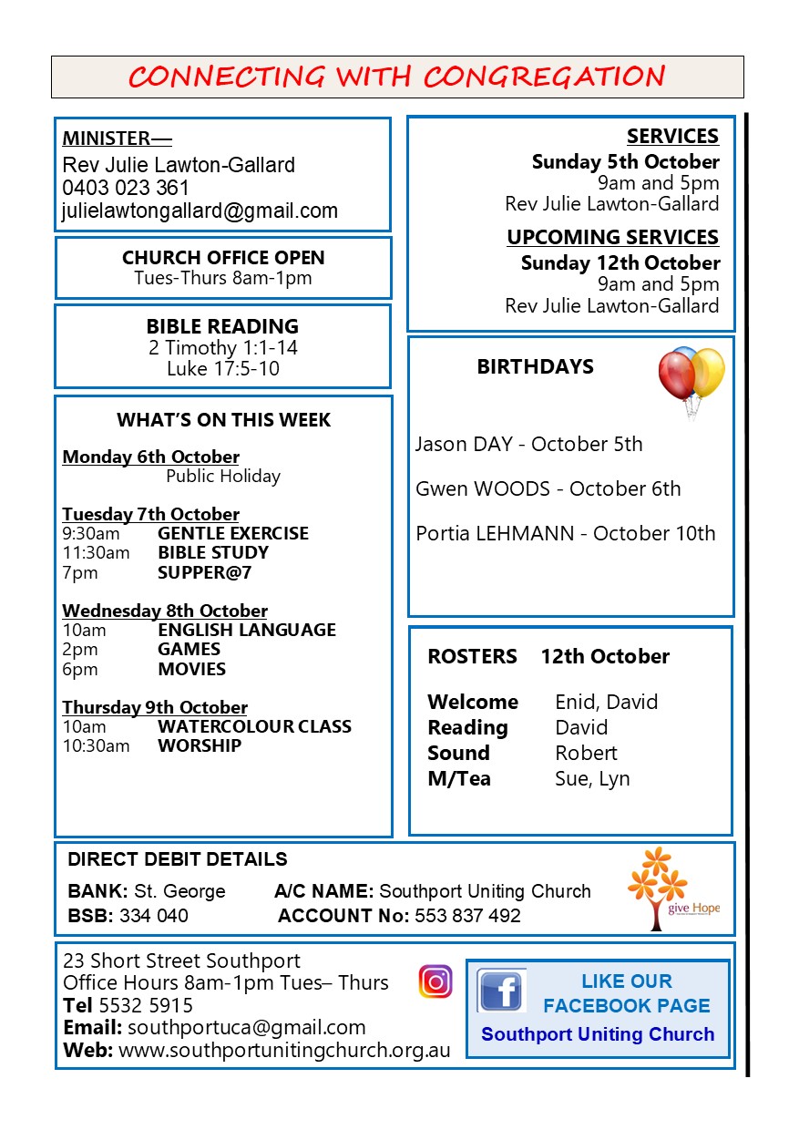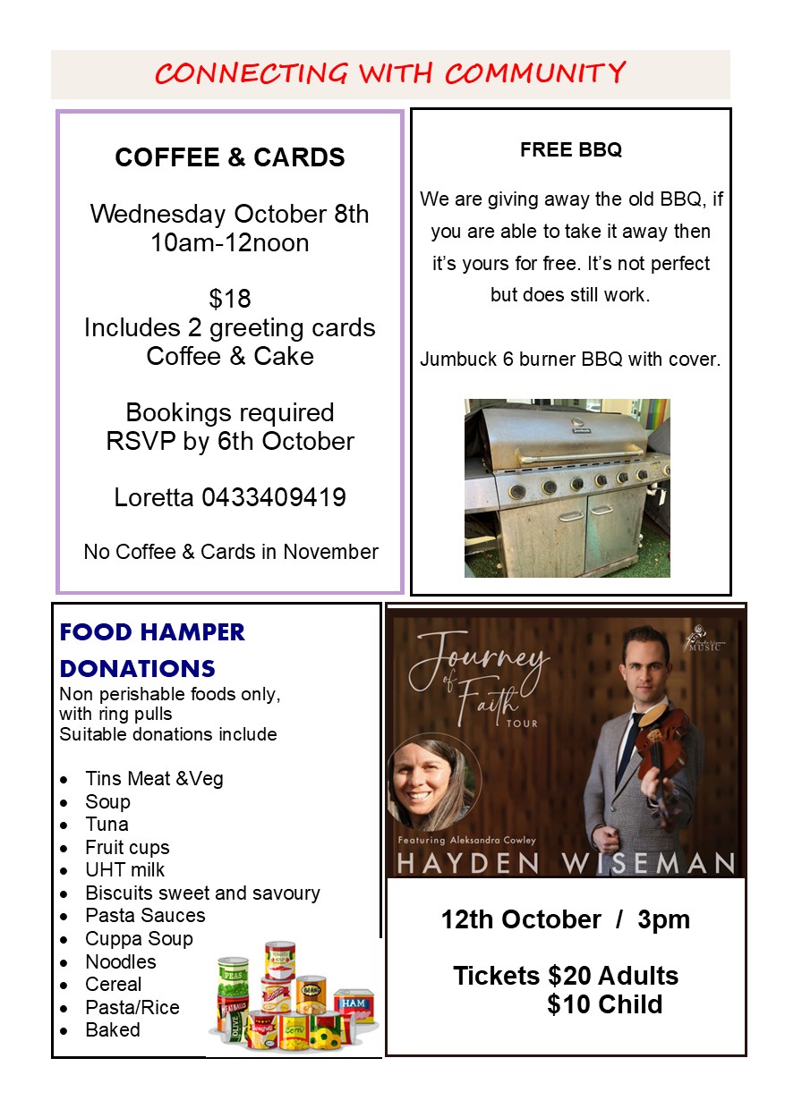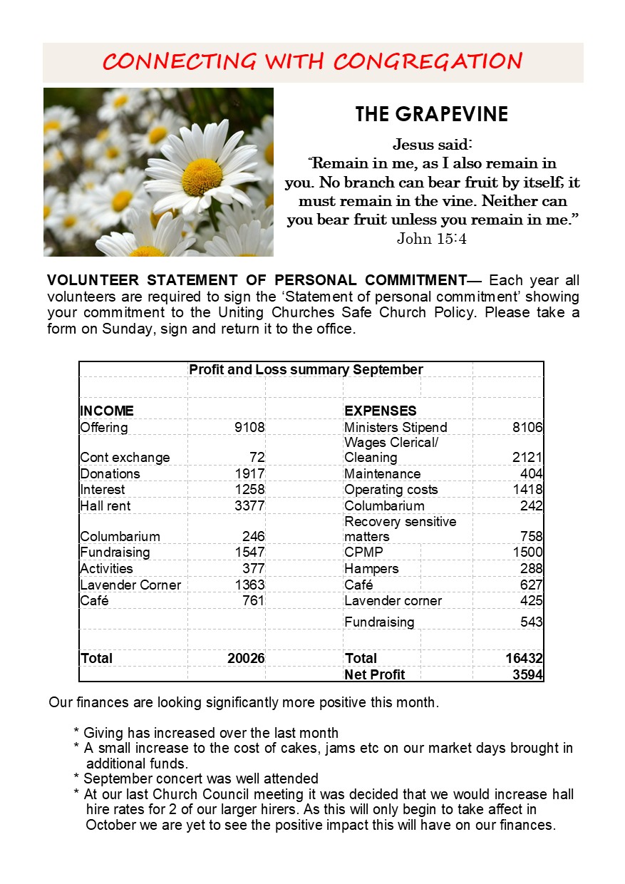 Thank you everyone who has increased their giving – our bank balance looks a lot heathier already. If we keep this up, we will definitely have a budget that is in the black. The month of September was a month of       challenge and you rose to the occasion. The committee organising the 100 year celebrations has decided to put on a lovely luncheon on the day, that will be a fully catered 2 course meal – as such the price of tickets is likely to be around $50 each, so we are encouraging you to start saving – we also don’t want the price to inhibit anyone from attending – so if it’s outside of your budget, please don’t be backwards in coming forwards – we will have some means and ways of supplementing the cost of tickets. For those of you interested in watching “the boy who harnessed the wind” it’s on Netflix – it’s a true story and inspiring to say the least. The outdoor fans have been     tested with the warmer weather and are much appreciated. This week we’ve had an outdoor security light installed in the café area. A few weeks ago, Jaye donated some carpet and his labour to the sound booth. Minnie’s    filming afternoon looked like a lot of fun – thank you to everyone who got involved. There is no indoor bowls this week due to the Kings Birthday long weekend. The technician came to look at our faulty sliding glass door today – so there are many things happening around the place, enhancing our spaces, rectifying issues and improving overall security. We were also the recipients of some office furniture from a business wanting to give it a good home. The Lavender corner now have their own office too!